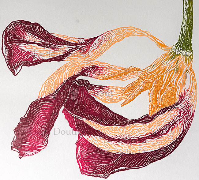 As the initial inspiration, four of the series – Spent Red Tulip I, II, III, and IV – are all of the same tulip in various media. Oils were to capture the best color, watercolors for the light and delicateness, and print for the striking lines. I was deeply enchanted by the radial design and dramatic coloring.