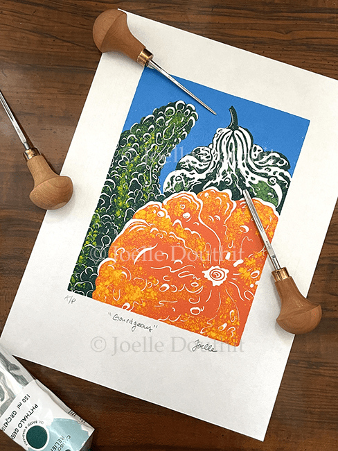 Gourdgeous is a jigsaw print: each section of color was cut out, inked, then reassembled and printed by hand. The extra color on the fancy gourds were applied by hand, so each of these prints is unique by nature.